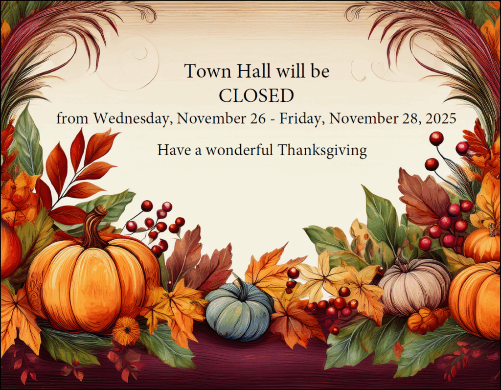 Posted on November 24, 2025, Edited November 24, 2025 by Town Clerk Townhall closed for the Thanksgiving Holiday